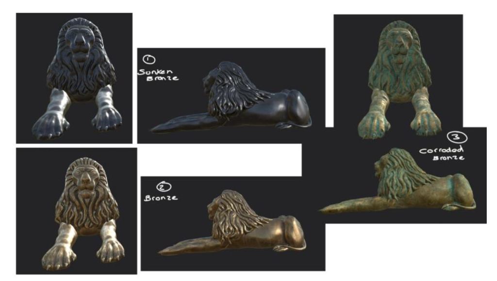 After doing some research into job roles, I felt I needed to improve my Zbrush sculpting skills, as well as my texturing skills. When creating this asset I spent a lot of time sculpting the Lion in Zbrush, and as a result of more practice I was able to complete it to a much higher standard than my Horse from my previous project and in much less time. This freed up more time for me to do some research into the materials I was making. I spent a lot of time researching bronze, finding out how its made and how natural and chemical patinas are formed/applied to bronze works. This allowed me to create a really realistic looking bronze texture for my lion that I feel is a huge improvement from my previous materials. I also spent some time working on my quad drawing skills and the topology of my model. This was as a response to some feedback I received about how the lion looked too low poly and the topology was originally inefficient. When i thought about it and looked back to my previous work I realized I needed to try harder to improve in this area. Using some online resources to help me learn how to clean up my topology I feel I managed to improve significantly. When compared to my horse, the lion’s topology is much cleaner and more efficient, meaning I managed to stick to my planned poly count. I could have retopologised the face for a second time in order to save some more polygons but as it was the highest detail area of the lion and had a lot of curves I felt it was OK to lend more polygons to it.
