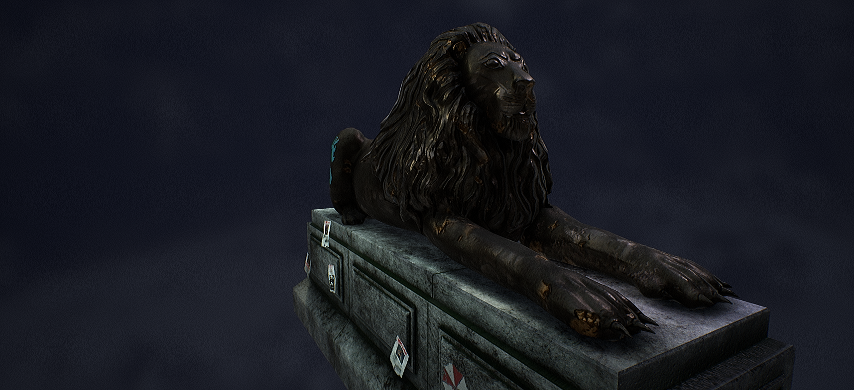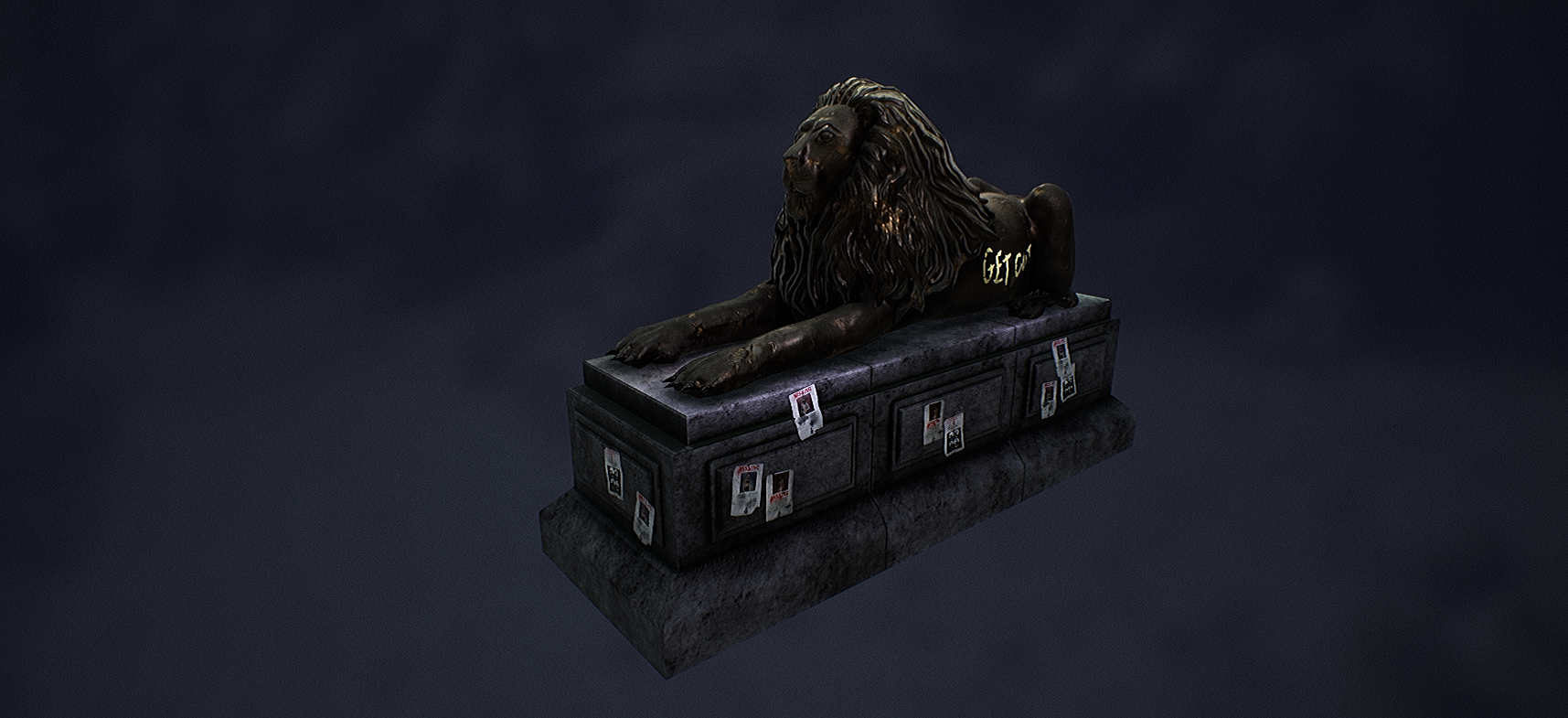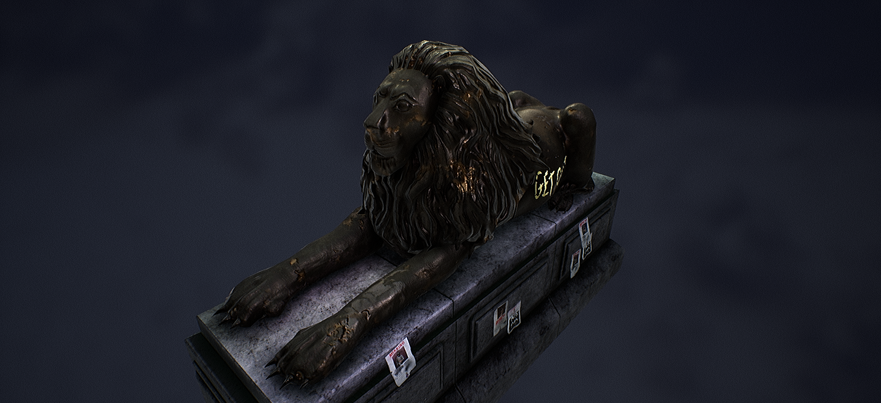 Overall I’m very happy with the result of my project and how I worked throughout the pipeline. I feel very proud of the final result and feel as though its the best piece of work I have produced so far. I spent a lot of time and effort creating this prop and have managed to improve the Zbrush sculpting and texturing skills that I specified in my brief, as well as some more skills like lighting and my Photoshop graphic design. If i’d had more time I might have spent longer creating a wider variety of posters in order to make them feel less repeated, however this is only a minor change. I would also perhaps measure the real Trafalgar square lions to make sure the model was to the right scale.
