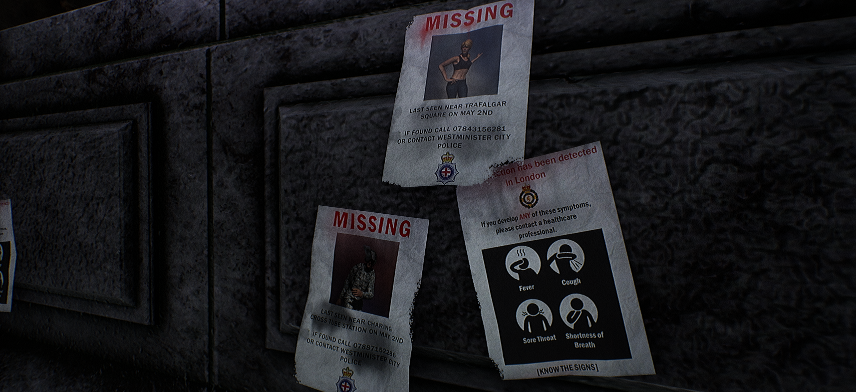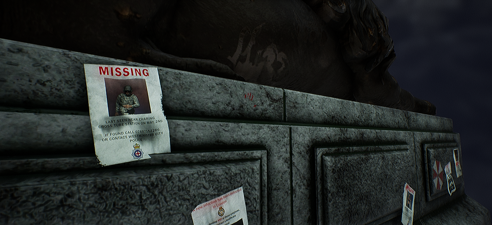 Additionaly, I spent a lot of time creating decals for the prop: Missing person posters that looked weathered, flyers warning residents of a new virus (to imitate the T-virus) and London police and ambulance logos that I created in Photoshop to put on the flyers. While I was making these I recieved some feedback that I should make them look more weathered and damaged, by adding some effects that made it look as though they had been rained on and then dried. To do so I added some more weathering and made the text look like the ink had dripped down the page and smudged. I also went into maya and changed the basemesh of each of the posters by adding more vertices and making them look more crumpled and less flat. This made them look much more realistic.
